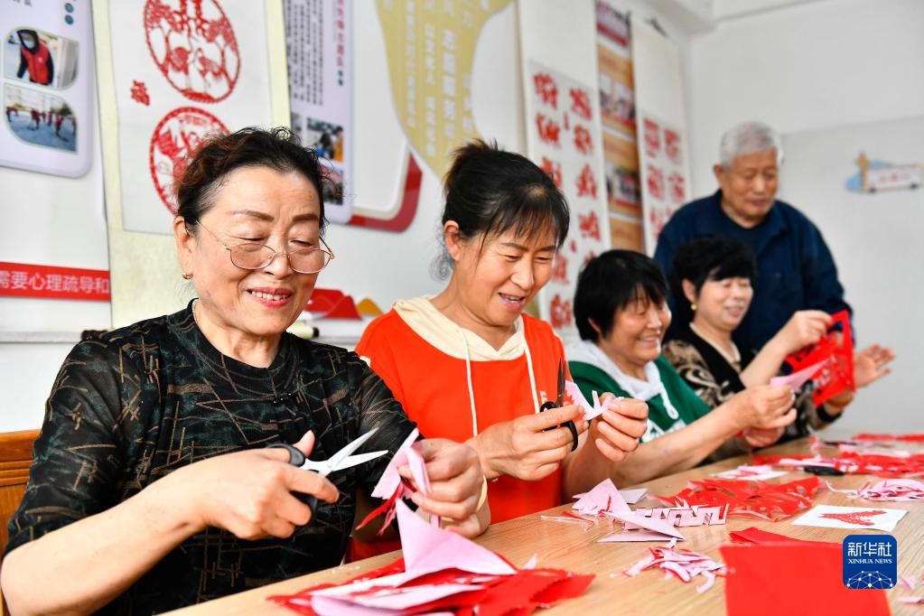6月24日,在乳山市祥和社區養老服務(wù)中心,老人們練習剪紙。