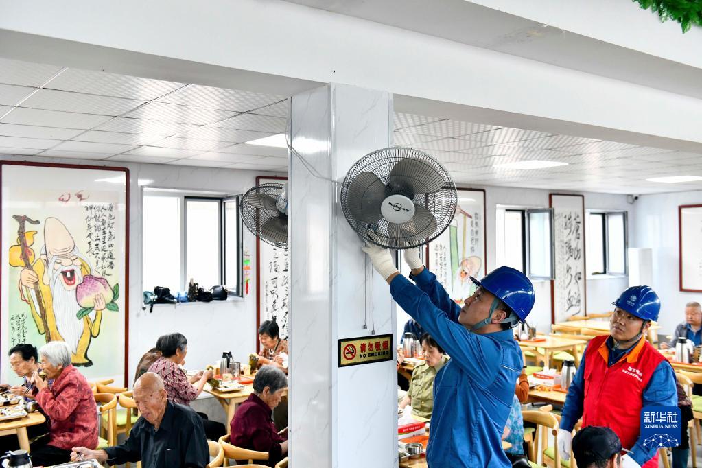 6月24日,在乳山市城區街道騰甲莊村幸福食堂,國網(wǎng)乳山市供電公司的夏季應急服務(wù)隊隊員在檢修電風(fēng)扇。