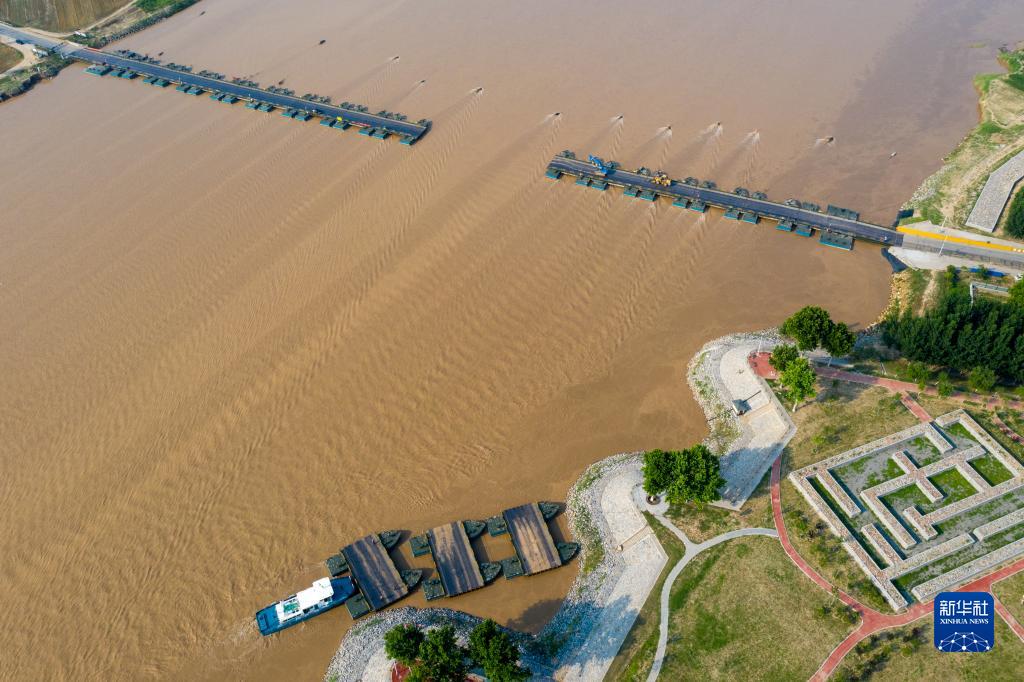 6月23日,作業(yè)船只拆除黃河山東段高青縣翟家寺浮橋(無(wú)人機照片)。