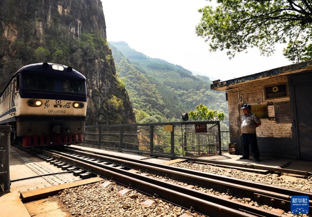 6月2日,火車(chē)駛過(guò)“人字橋”時(shí),楊有光在軌道旁跨立觀(guān)察。