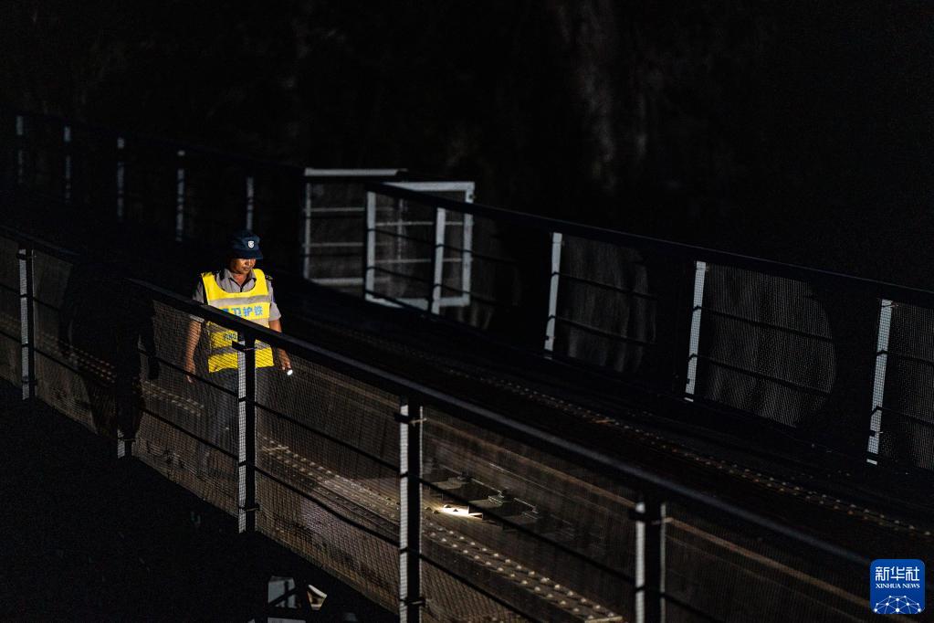 6月20日晚,楊有光手持手電筒巡視“人字橋”橋面。