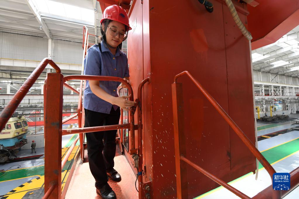 在中國鐵路太原局集團有限公司太原機務(wù)段太北檢修車(chē)間,天車(chē)司機王孟媛在工作結束后走下天車(chē)(6月15日攝)。