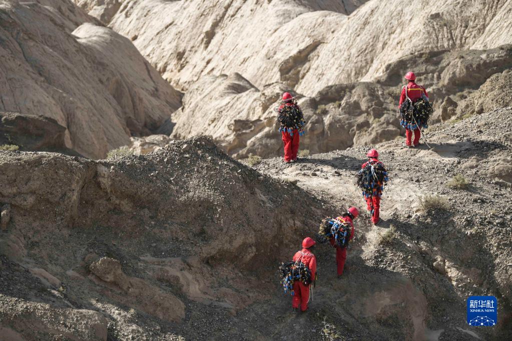 東方物探公司塔里木物探處2170隊放線(xiàn)班組的工人背著(zhù)檢波器向施工點(diǎn)位行進(jìn)(6月20日攝)。