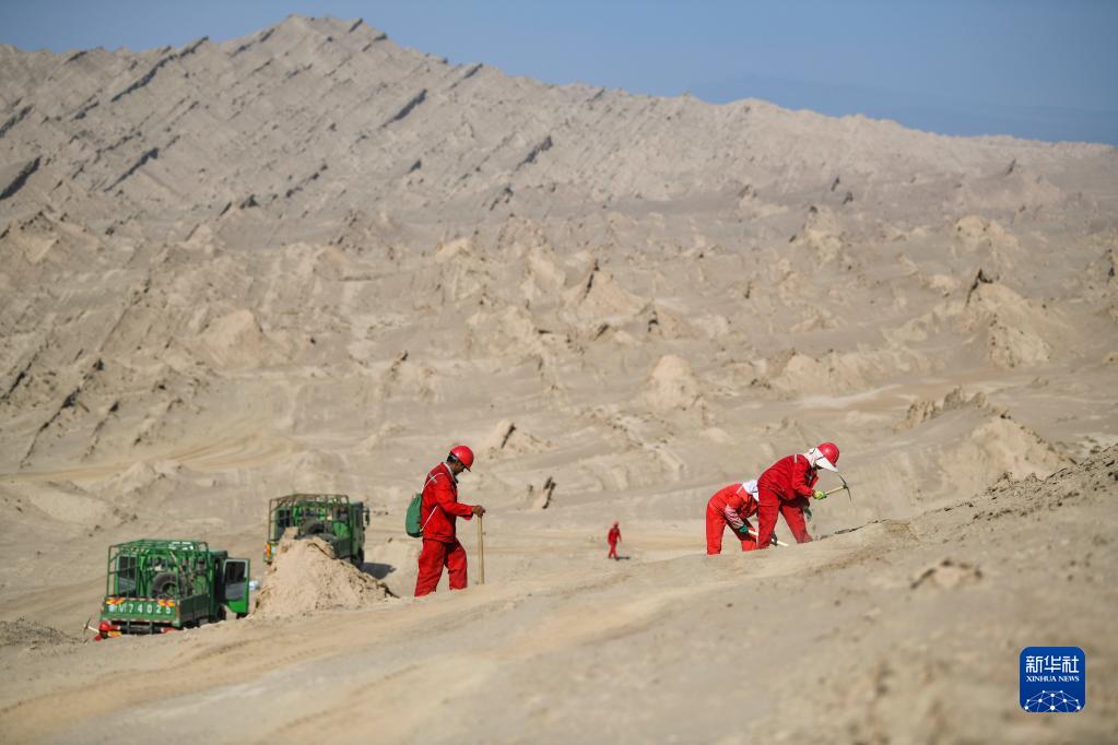 東方物探公司塔里木物探處2170隊放線(xiàn)班組的工人在山區埋置檢波器(6月19日攝)。
