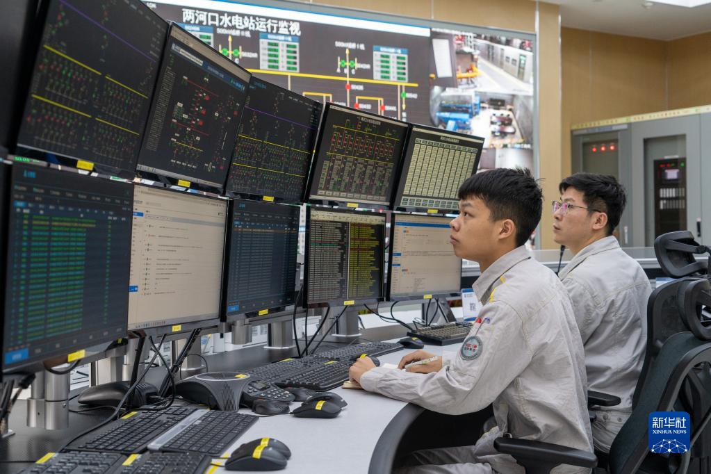 在兩河口水電站中控室內,工作人員在對水電與光伏發(fā)電進(jìn)行調度和監視控制(6月22日攝)。