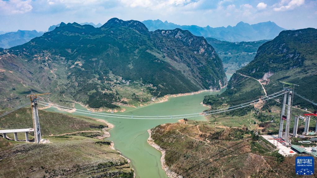 6月25日,納晴高速牂牁江大橋主纜牽引順利完成(無(wú)人機照片)。