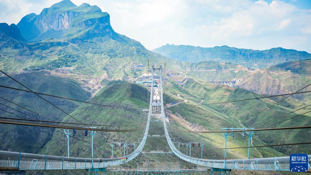 納晴高速牂牁江大橋主纜牽引順利完成(6月25日攝)。