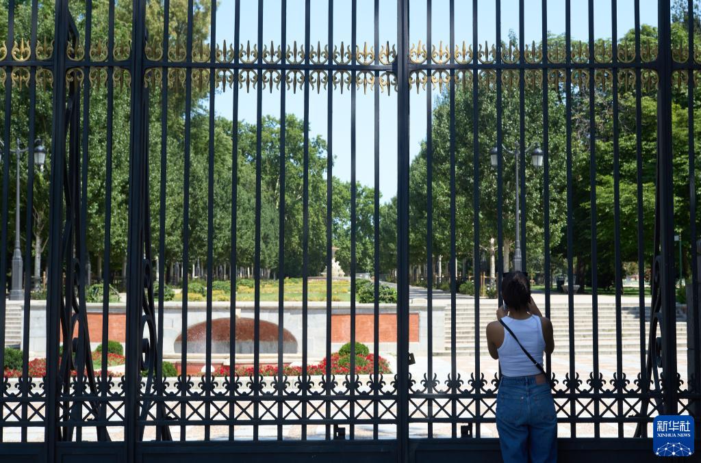 6月25日,一名女子在西班牙馬德里因高溫紅色警報關(guān)閉的麗池公園外拍攝。