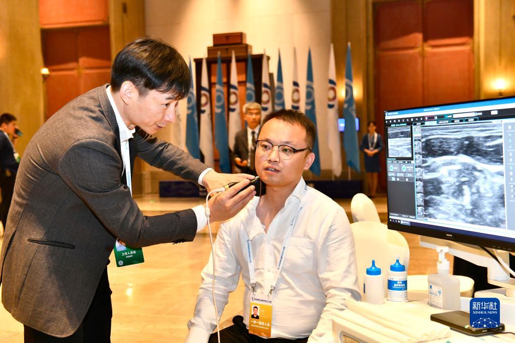 6月26日,在世界互聯(lián)網(wǎng)大會(huì )數字文明尼山對話(huà)上,與會(huì )嘉賓在體驗AI人工智能超聲篩查機器人診斷服務(wù)。