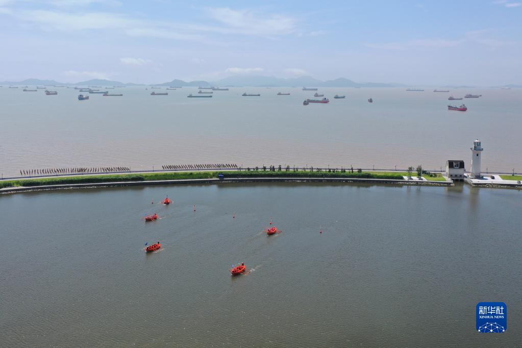 6月26日,參賽隊伍在浙江舟山長(cháng)峙島攬月湖參加水上操艇比賽(無(wú)人機照片)。