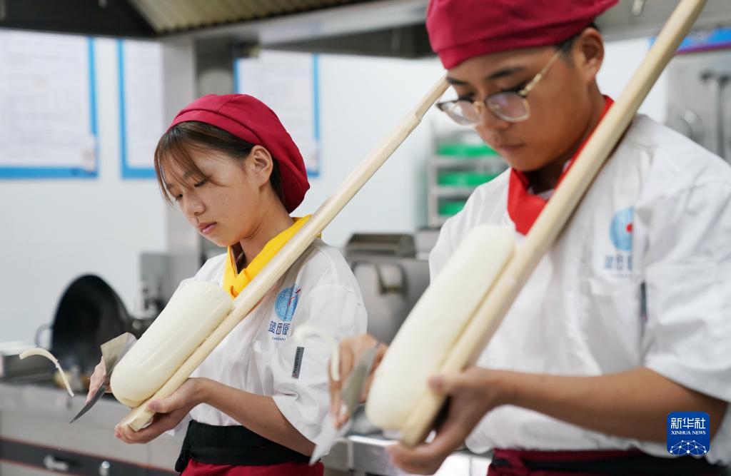 6月25日,在位于西安市藍田縣的藍田廚師學(xué)校中式面點(diǎn)實(shí)訓室,學(xué)生在練習削面。