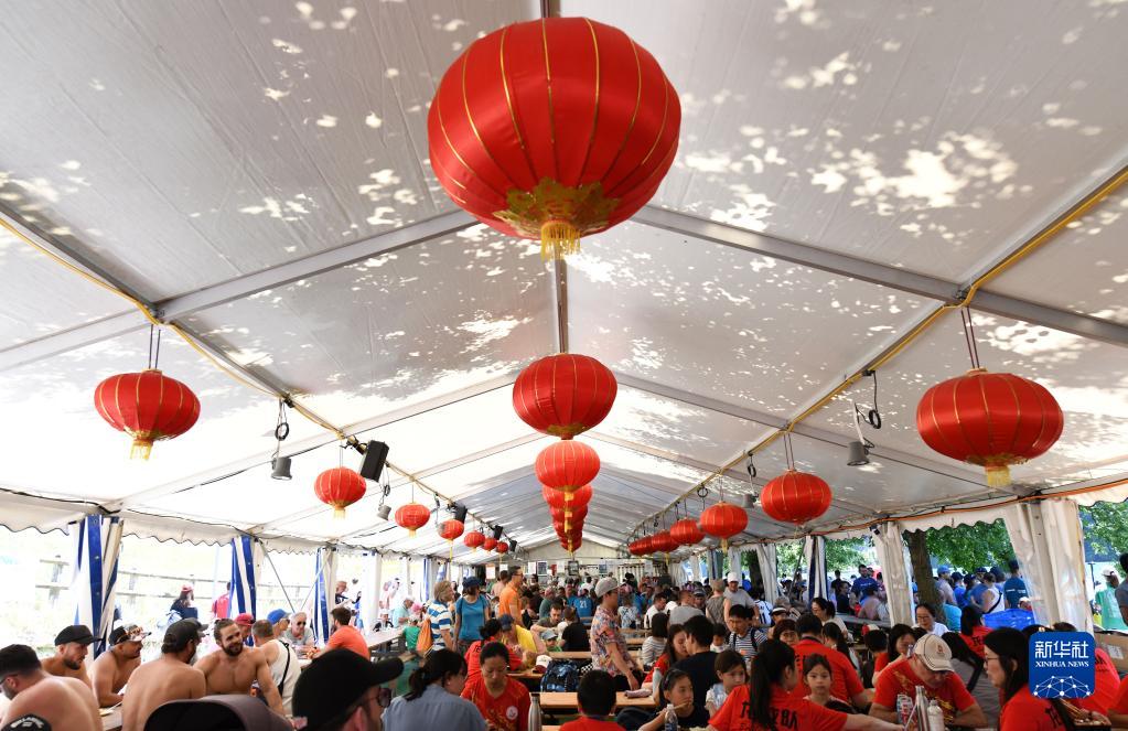 6月25日,在瑞士埃格利紹,人們在賽龍舟活動(dòng)上品嘗美食。