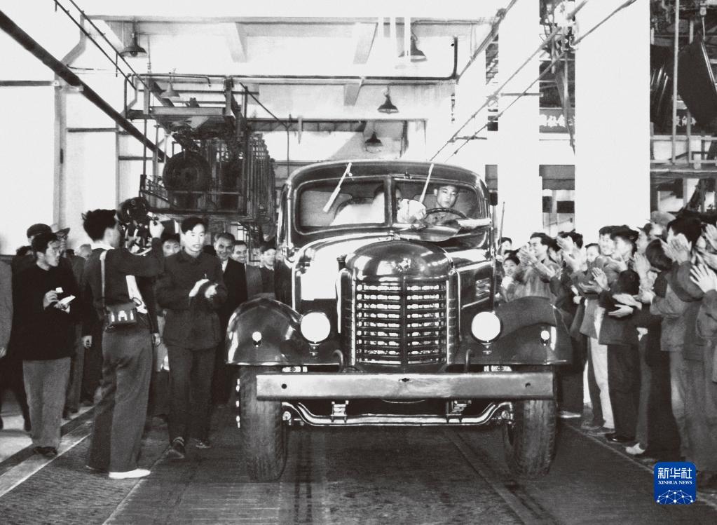 1956年7月13日,第一輛解放牌汽車(chē)駛下裝配線(xiàn)(資料照片)。