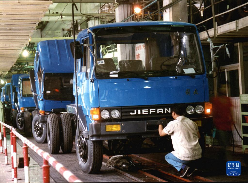 1995年,解放第三代產(chǎn)品6噸平頭柴油車(chē)開(kāi)始批量生產(chǎn)。這是工人在生產(chǎn)線(xiàn)上對車(chē)輛進(jìn)行裝配作業(yè)(資料照片)。