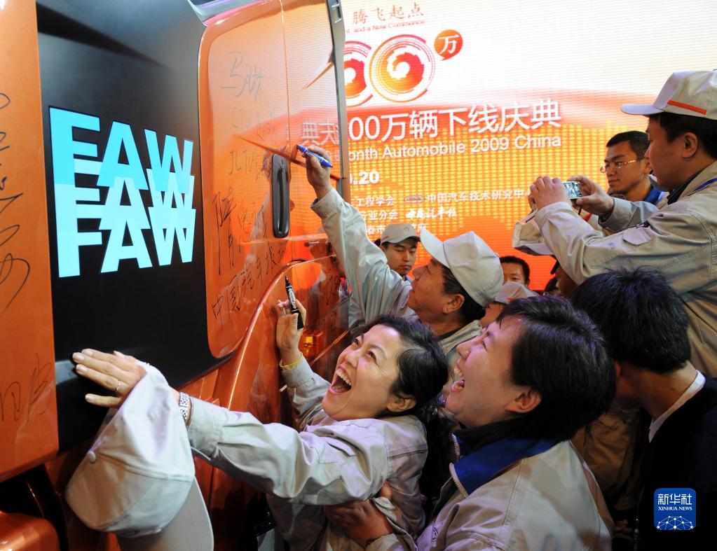 2009年10月20日,2009年第1000萬(wàn)輛汽車(chē)在長(cháng)春一汽誕生。中國成為繼美、日之后第三個(gè)汽車(chē)年產(chǎn)破千萬(wàn)輛的國家,進(jìn)入千萬(wàn)輛汽車(chē)大國行列。這是一汽解放的工人們在自己親手生產(chǎn)的2009年中國第1000萬(wàn)輛車(chē)上簽名。