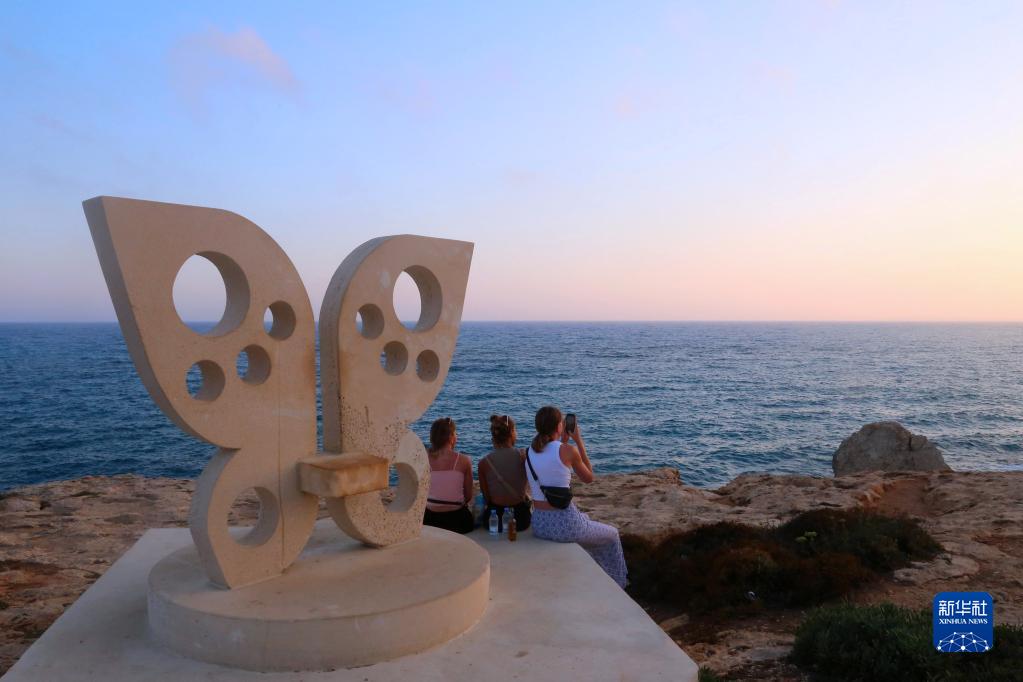 6月26日,人們在塞浦路斯圣納帕“愛(ài)之橋”拍攝海邊落日。