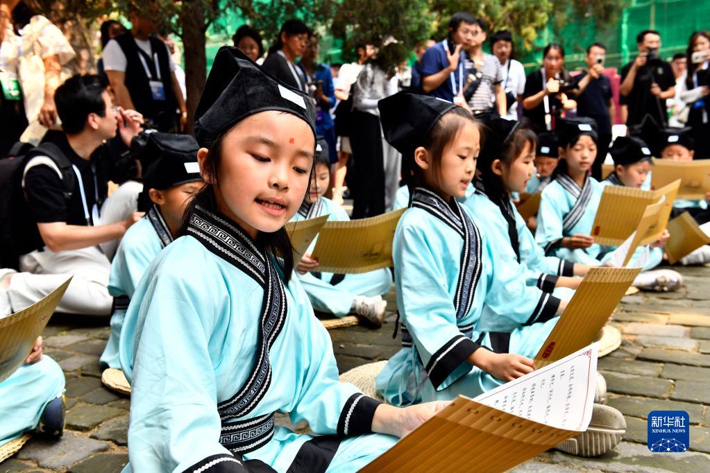 6月27日,在曲阜孔廟,孩子們在老師帶領(lǐng)下誦讀《論語(yǔ)》。