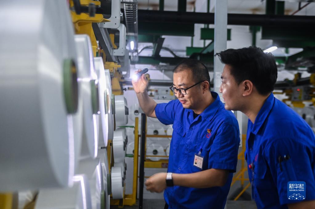 6月27日,在桐昆集團浙江恒超化纖有限公司聚紡車(chē)間內,黨支部書(shū)記戚黎洲(左)指導新員工學(xué)習質(zhì)檢流程及要點(diǎn)。