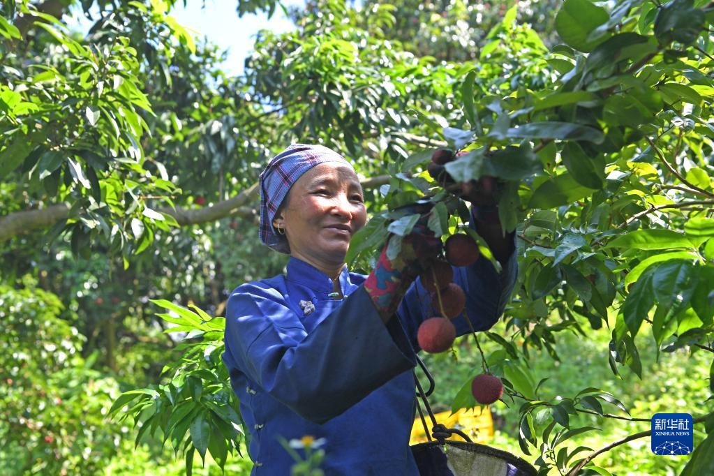 6月27日,廣西北流市北流鎮六行村村民在采摘荔枝。