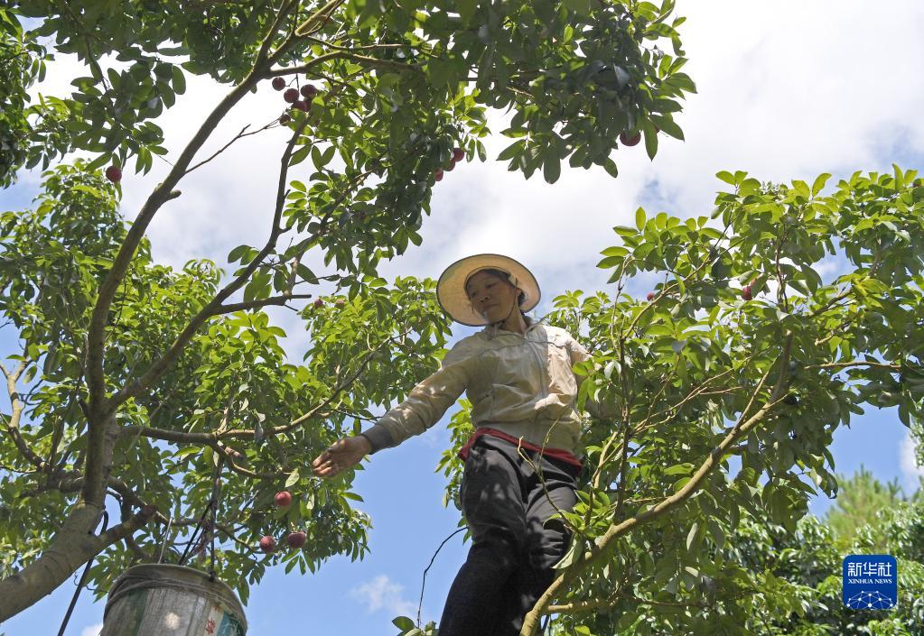 6月27日,廣西北流市北流鎮六行村村民在采摘荔枝。