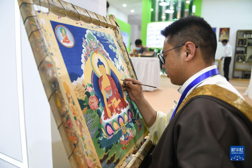 6月27日,在第四屆全國殘疾人展能節上,來(lái)自西藏的達增現場(chǎng)繪制唐卡。