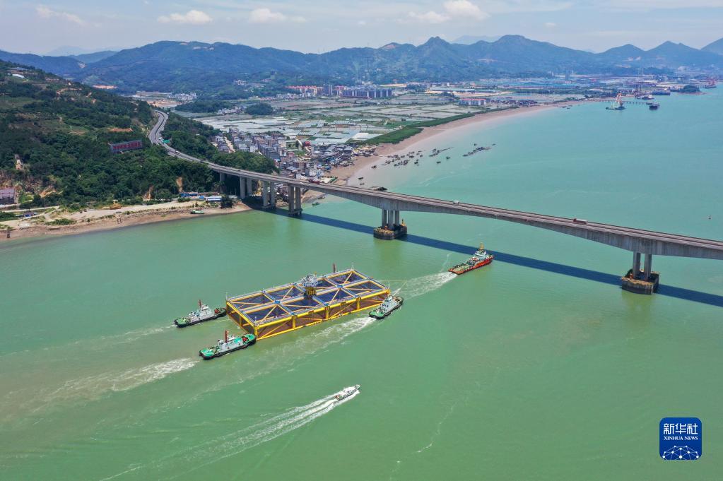 6月27日,深遠海養殖平臺“寧德1號”在拖輪協(xié)助下通過(guò)沈海高速下白石特大橋(無(wú)人機照片)。