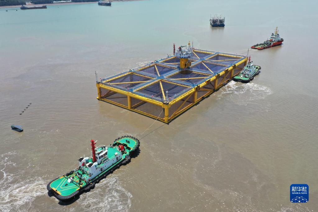 6月27日,在福建福安白馬江上,拖船牽引深遠海養殖平臺“寧德1號”出海(無(wú)人機照片)。