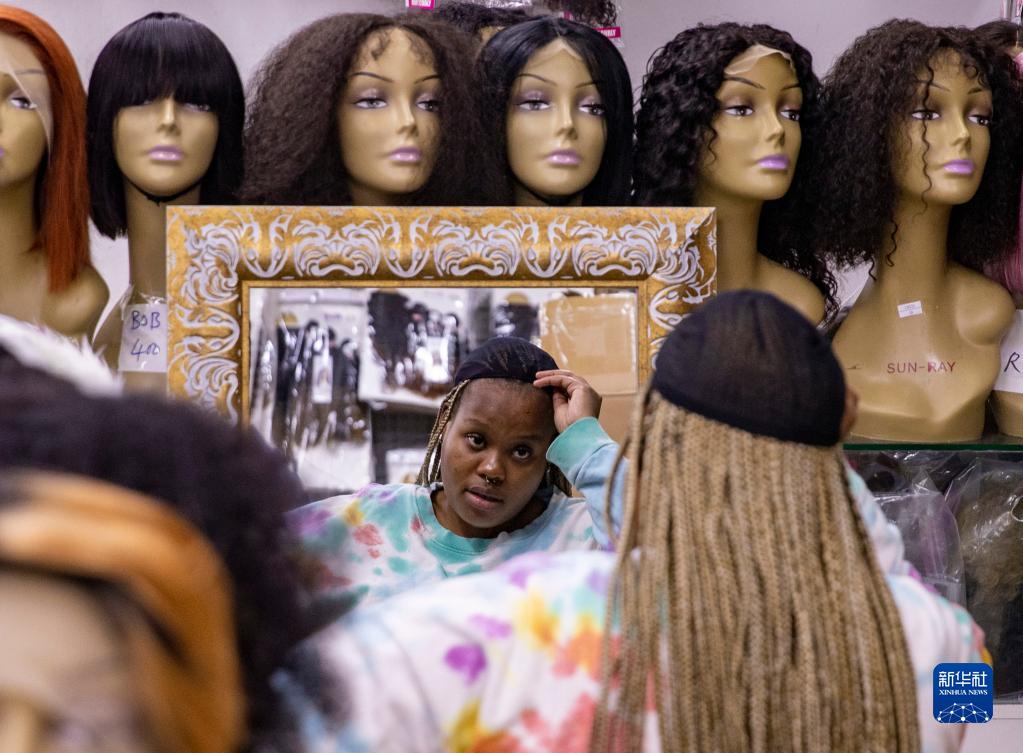 6月9日,在湖南邵陽(yáng)陽(yáng)光發(fā)品有限公司位于南非約翰內斯堡的店鋪內,顧客在試戴假發(fā)。