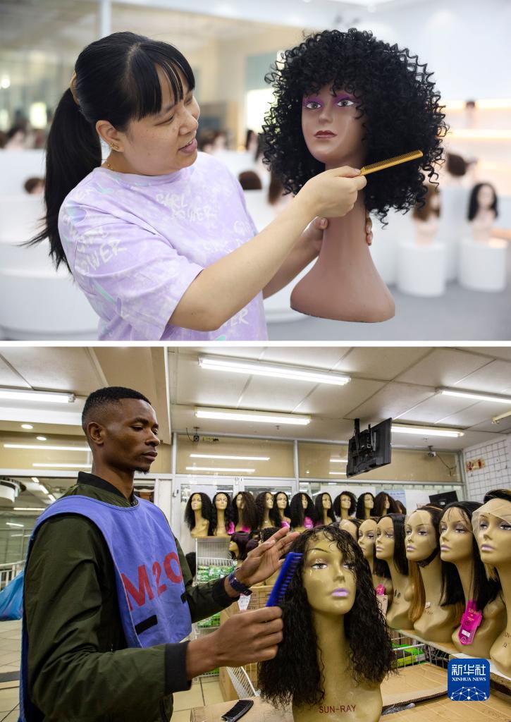 拼版照片:上圖為5月25日,工人在湖南邵陽(yáng)陽(yáng)光發(fā)品有限公司展廳內展示假發(fā)(新華社記者薛宇舸攝);下圖為6月9日,一名店員在湖南邵陽(yáng)陽(yáng)光發(fā)品有限公司位于南非約翰內斯堡的店鋪內展示假發(fā)(新華社記者張譽(yù)東攝)。
