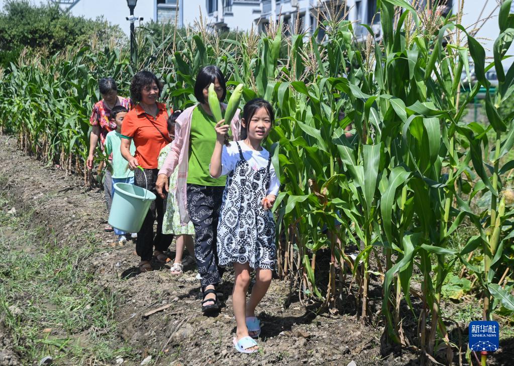 6月28日,在塘棲鎮丁河村的共富工坊農業(yè)果園內,小朋友體驗采摘。