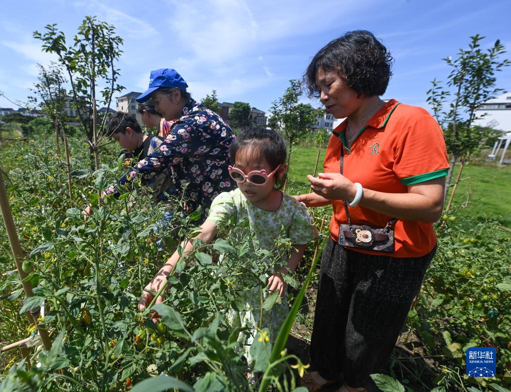 6月28日,在塘棲鎮丁河村的共富工坊農業(yè)果園內,小朋友體驗采摘。