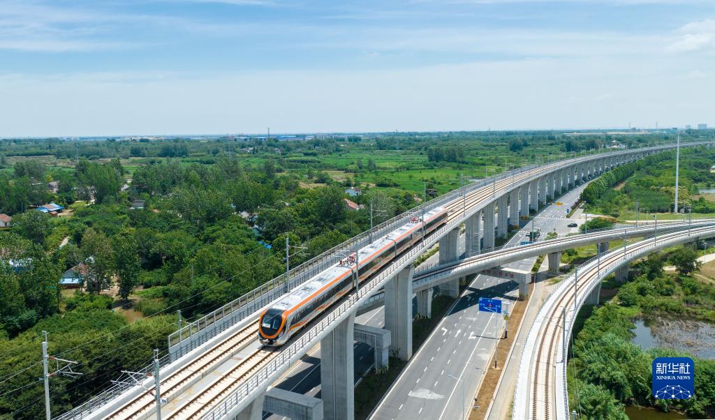 這是在滁州市來(lái)安縣境內拍攝的滁寧城際鐵路列車(chē)(6月28日攝,無(wú)人機照片)。