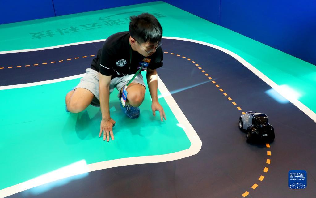 6月28日,來(lái)自東華大學(xué)的參賽選手在進(jìn)行全自動(dòng)駕駛賽車(chē)比賽時(shí)輔助調整車(chē)輛運行,該款賽車(chē)具備人工智能技術(shù)機器核心算法學(xué)習能力。
