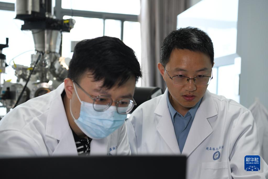 6月28日,在中科院合肥物質(zhì)科學(xué)研究院強磁場(chǎng)科學(xué)中心實(shí)驗室,郝林(右)和學(xué)生分析樣品的原子級精準可控生長(cháng)情況。