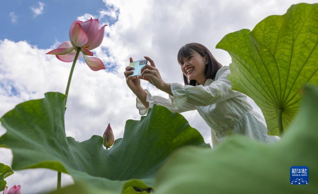 6月27日,游客在貴州省黔東南苗族侗族自治州岑鞏縣客樓鎮下寨村荷塘拍照。