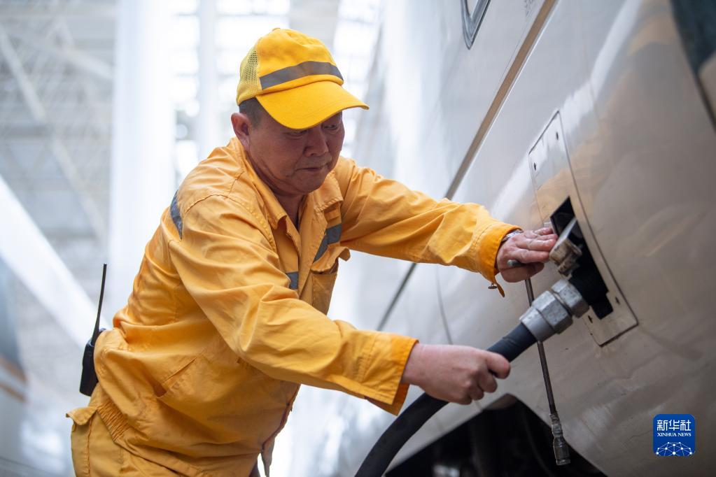 6月29日,溫州保潔工區的工人對??繙刂菽险镜母哞F列車(chē)進(jìn)行上水卸污作業(yè)。