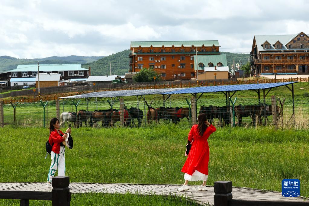 6月29日,游客在蒙兀室韋蘇木一處游船碼頭拍照。