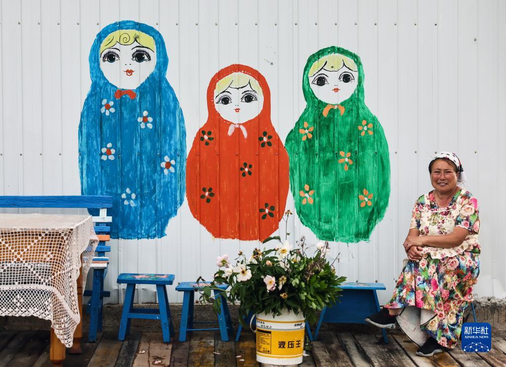 6月28日,考占花在繪有套娃的一面墻邊休息??颊蓟ㄊ嵌砹_斯族,2004年開(kāi)始經(jīng)營(yíng)俄羅斯族家庭游。