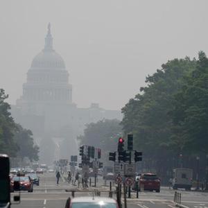 6月29日,在美國首都華盛頓,國家公園的一名員工戴著(zhù)口罩工作,遠處的國會(huì )大廈籠罩在煙霧中。