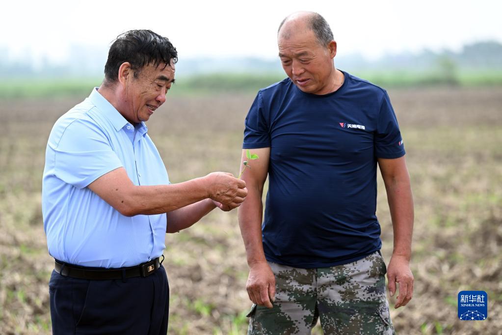 6月26日,徐淙祥(左)在太和縣舊縣鎮張槐村指導村民張丙銀種植大豆。