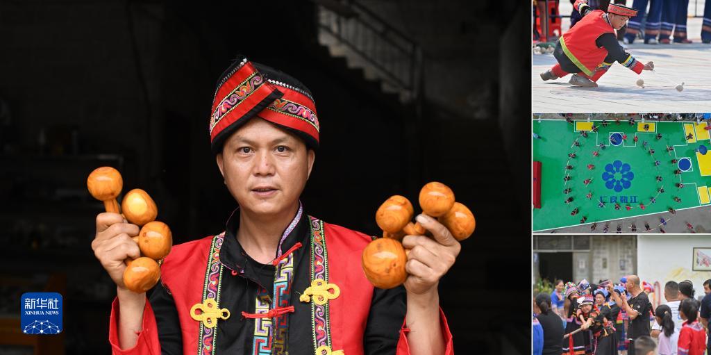 拼版照片:左圖為廣西大化瑤族自治縣大化鎮仁良村44歲的“70后”黨員韋壽基(2023年4月22日攝);右上圖為韋壽基在陀螺比賽中(2023年5月1日攝);右中圖為仁良村村民在陀螺文化廣場(chǎng)跳民族舞蹈(2023年6月22日無(wú)人機拍攝);右下圖為韋壽基組織村民進(jìn)行拔河比賽,喜迎端午節(2023年6月22日攝)。