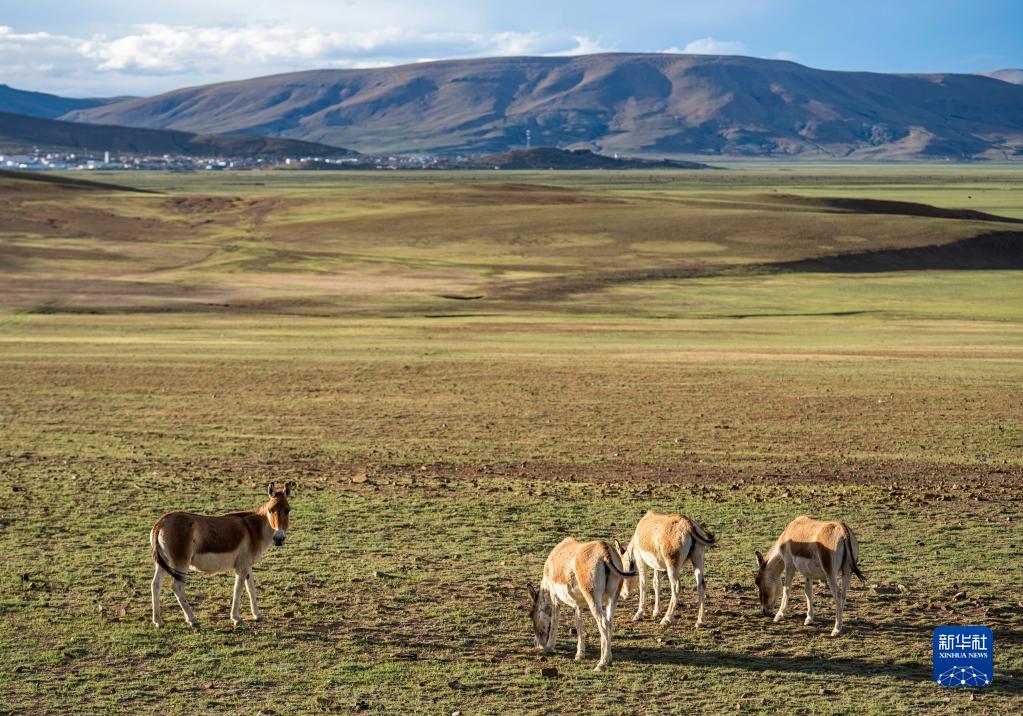 在哲古草原上覓食的藏野驢(6月28日攝)。