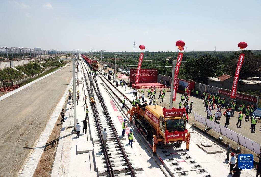6月30日,在位于山東省煙臺市蓬萊區的濰煙高鐵施工現場(chǎng),中鐵一局鋪軌機組施工人員在進(jìn)行鋪軌作業(yè)(無(wú)人機照片)。