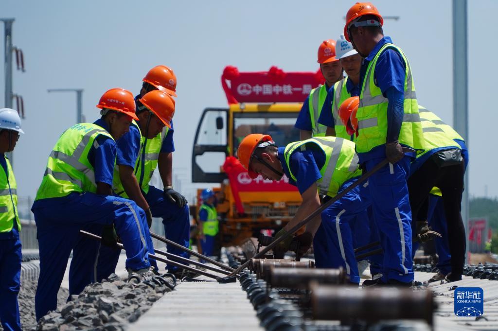 6月30日,在位于山東省煙臺市蓬萊區的濰煙高鐵施工現場(chǎng),中鐵一局鋪軌機組施工人員在進(jìn)行鋪軌作業(yè)。