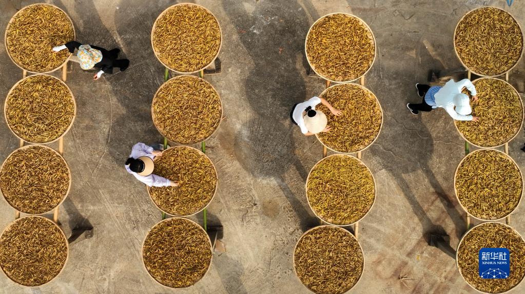 6月30日,在衡陽(yáng)市祁東縣黃土鋪鎮,村民在晾曬黃花菜(無(wú)人機照片)。