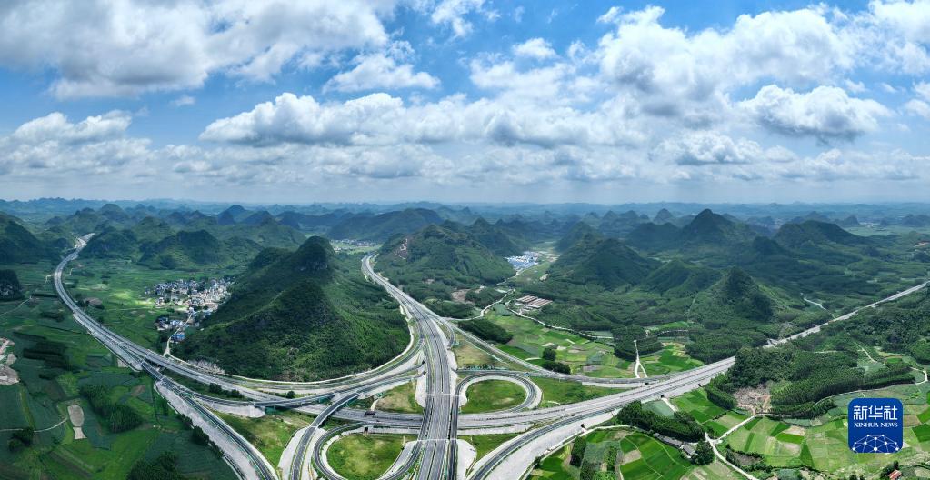 6月30日拍攝的剛建成通車(chē)的廣西賀巴高速象州至柳江段馬坪北樞紐互通(無(wú)人機照片)。