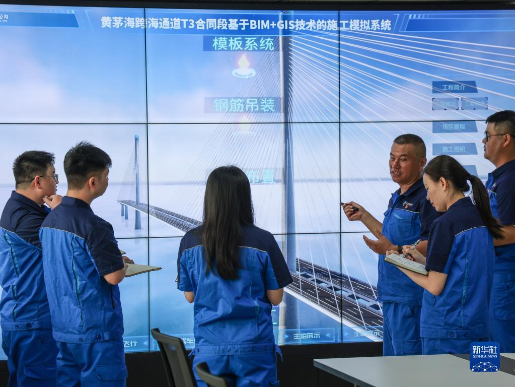 中交路建黃茅??绾Mǖ理椖奎h支部書(shū)記司傳波(右三)帶領(lǐng)黨員質(zhì)量提升先鋒小組研究BIM技術(shù)施工模擬系統(6月29日攝)。