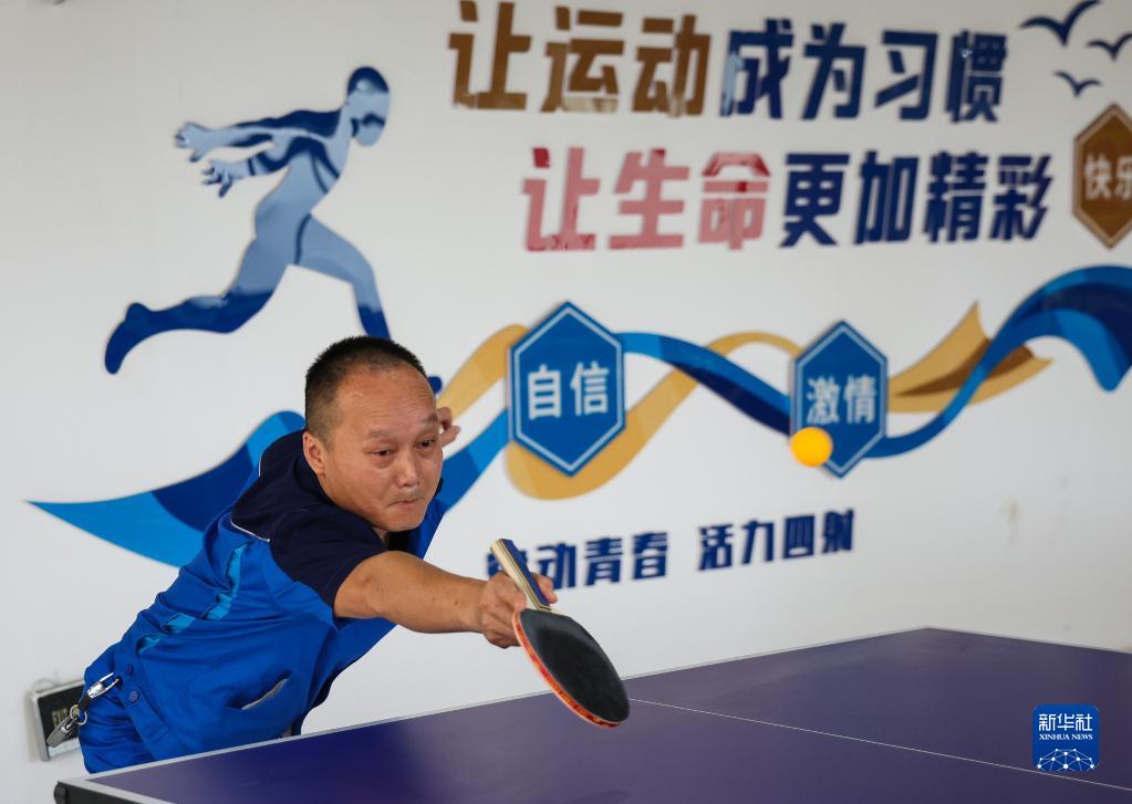 中交路建黃茅??绾Mǖ理椖坎繂T工在文體活動(dòng)室打乒乓球(6月29日攝)。