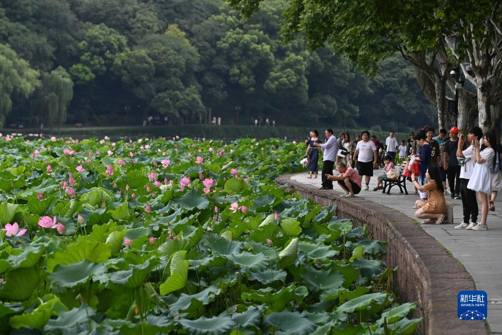 時(shí)值盛夏,杭州西湖景區荷花競相綻放,呈現出“接天蓮葉無(wú)窮碧,映日荷花別樣紅”的美麗景象。