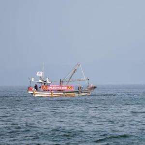 7月26日,在韓國全羅南道寶城郡沿海一帶,韓國漁民手持標語(yǔ)參加集會(huì )活動(dòng),抗議日本核污染水排海。